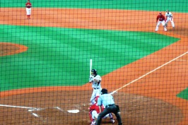 よく見える、見える!んだが、前の席の女性2人が前に乗り出してホームベースが見えん……。しかもうちの真ん前の人に至っては大きなお団子頭やからよけいに見えん!!!